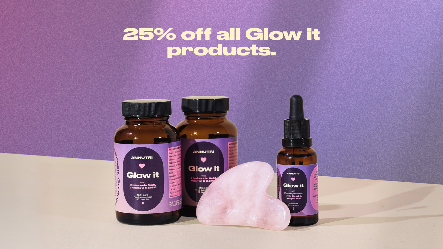 View ProductsEnhance your skincare routine our GLOW IT range. Experience a rich blend of botanical oils designed to hydrate and brighten your skin from the outside in and support you skin health with our carefully formulated supplement that nurtures your skin form within.