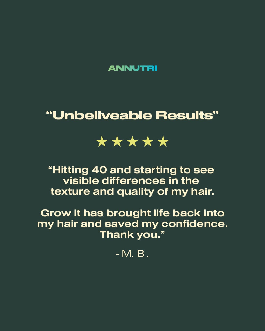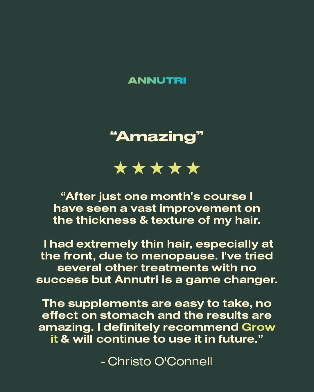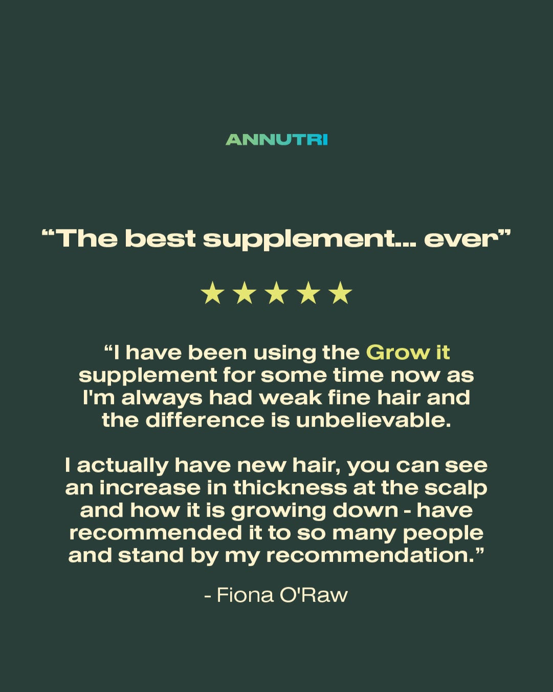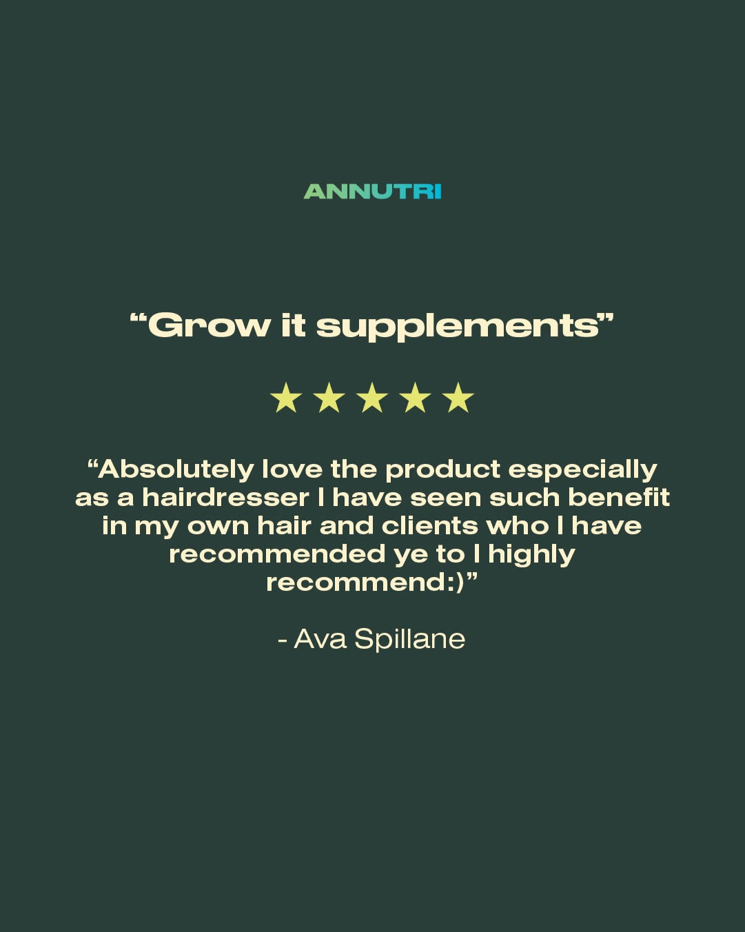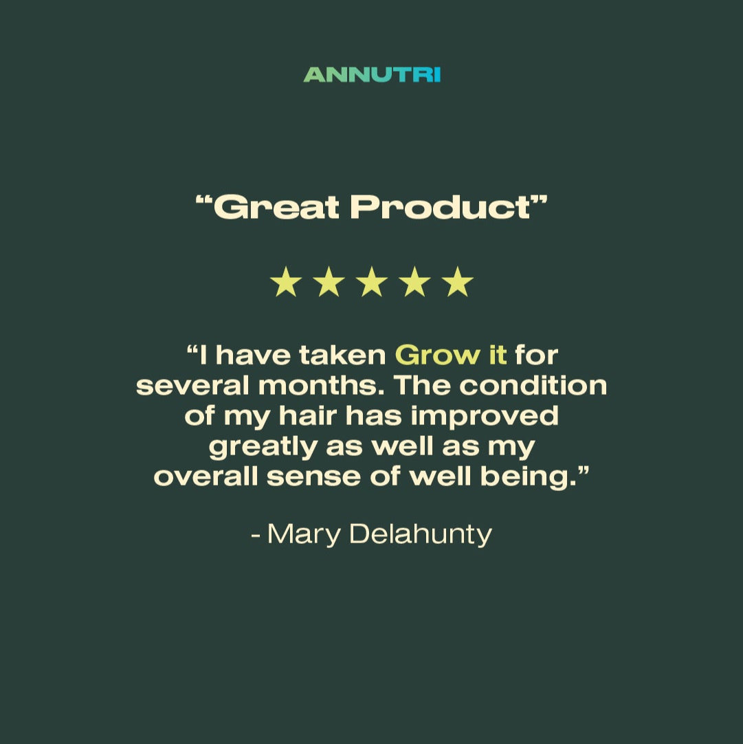 The six pack. Get your hands on six months supply of Grow It and save €6 with FREE shipping. That’s a whopping 360 capsules! (our recommended daily dose is 2 capsules per day). Get growing with Grow It, the perfect foundation to encourage stronger, longer, thicker hair.